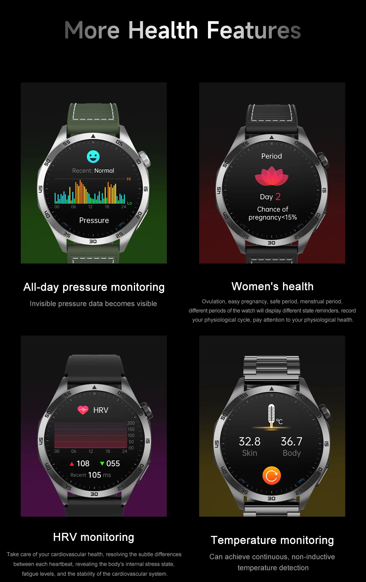 Health Tracking: ECG, PPG, HRV, blood oxygen, blood pressure, uric acid, lipids, temperature, stress, respiratory rate, sleep, AI health diagnosis