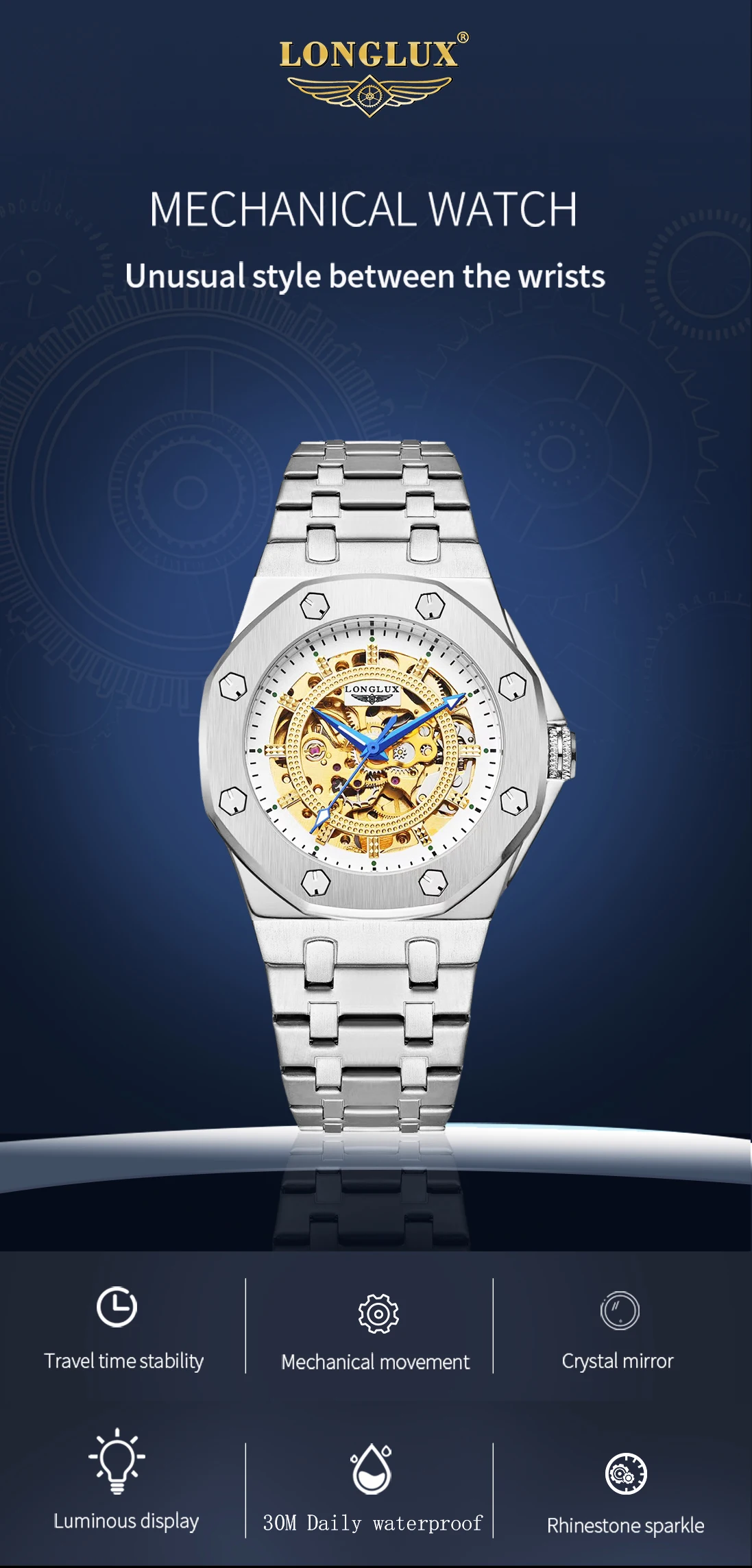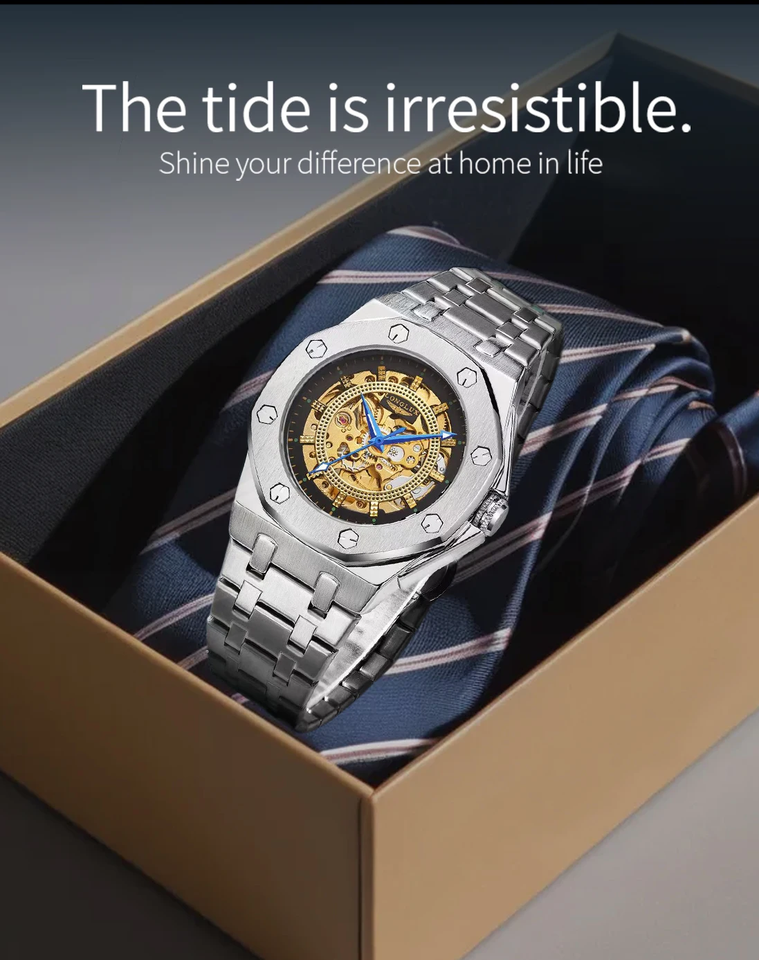 Skeleton Design – Exquisite transparent dial showcasing the detailed craftsmanship of every moving gear.