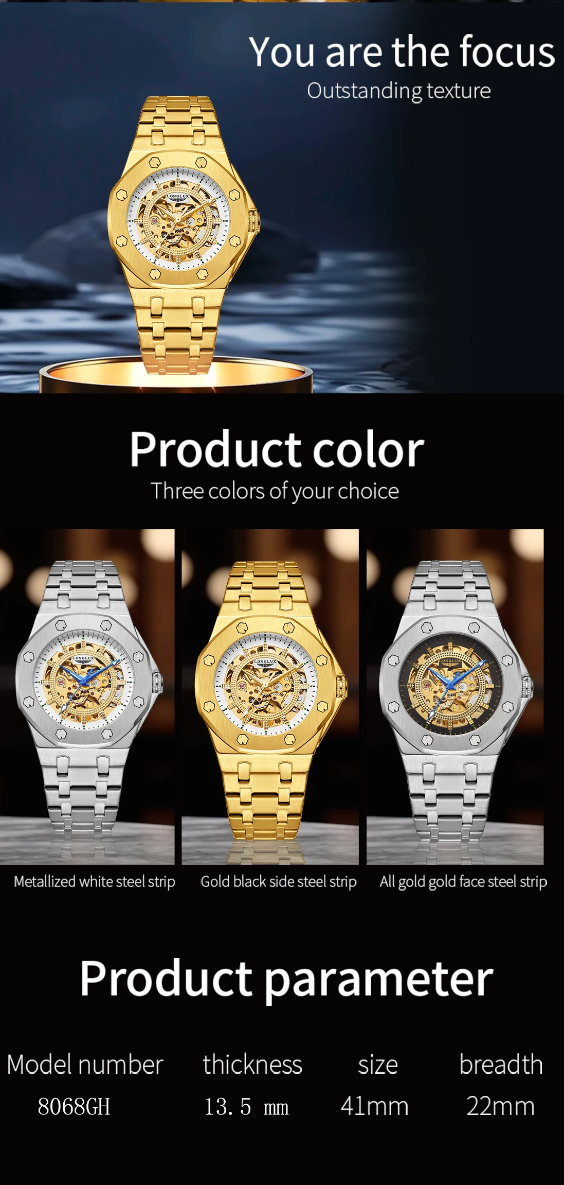 Comfortable Fit – Adjustable push-button hidden clasp and ergonomic band for a refined, all-day feel.